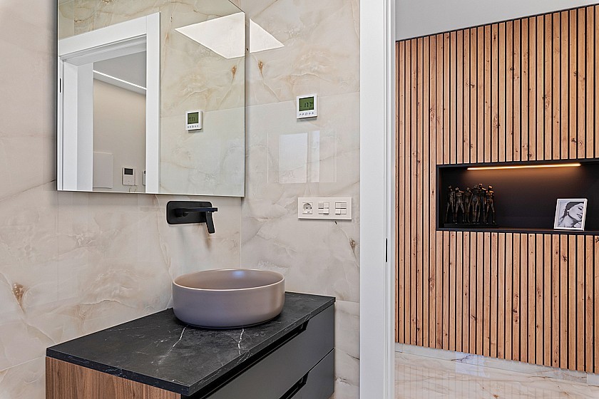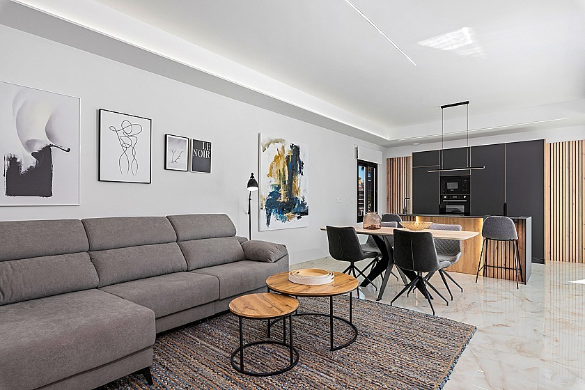 Diese stilvollen Villen sind auf einer Ebene gebaut und bieten ein durchdachtes und großzügiges Raumkonzept mit hochwertigen Materialien und eleganten Oberflächen. Der offene Grundriss maximiert das natürliche Licht und sorgt für eine fließende Verbindung zwischen Innen- und Außenbereichen.