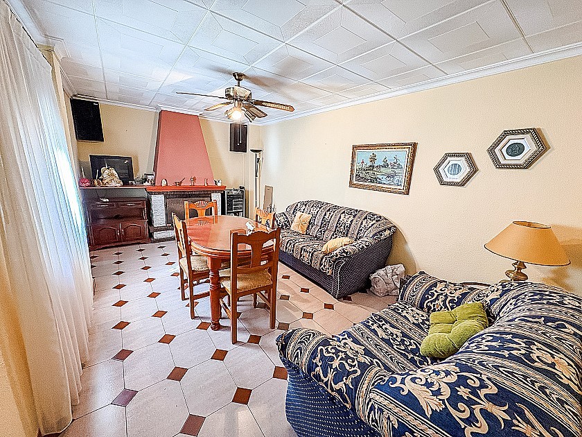 - Helles Wohn- und Esszimmer mit Kamin und Deckenventilator für eine gemütliche Atmosphäre.