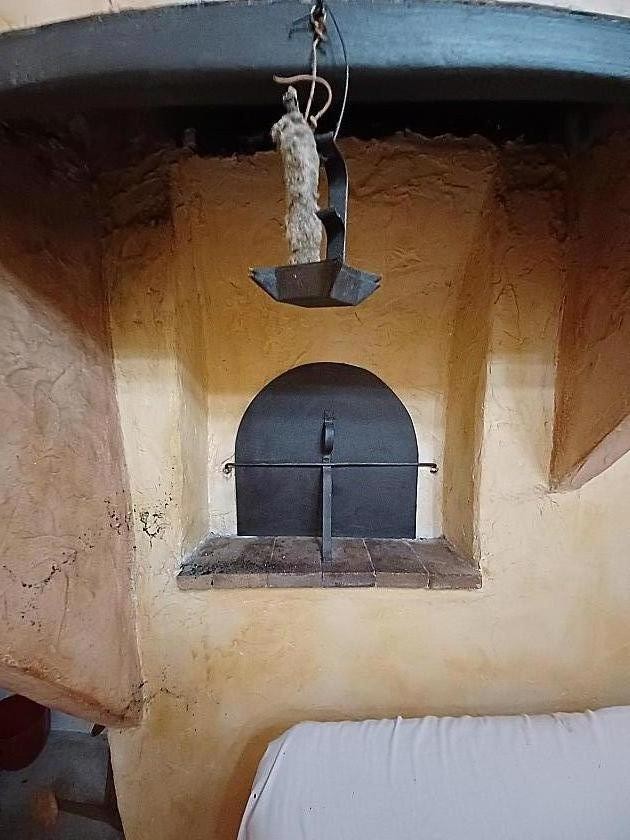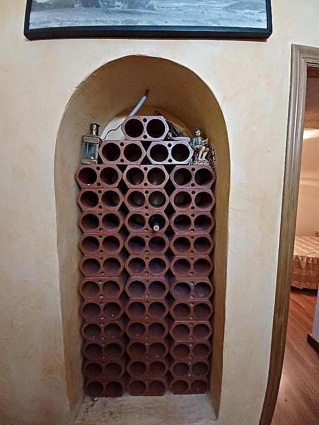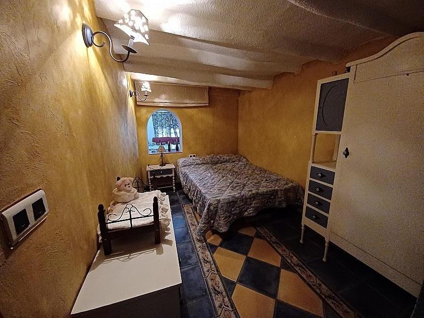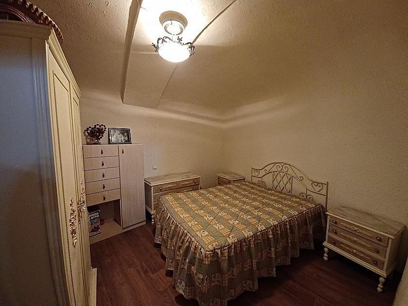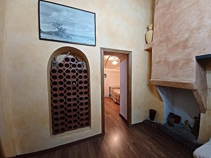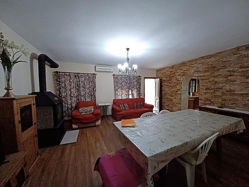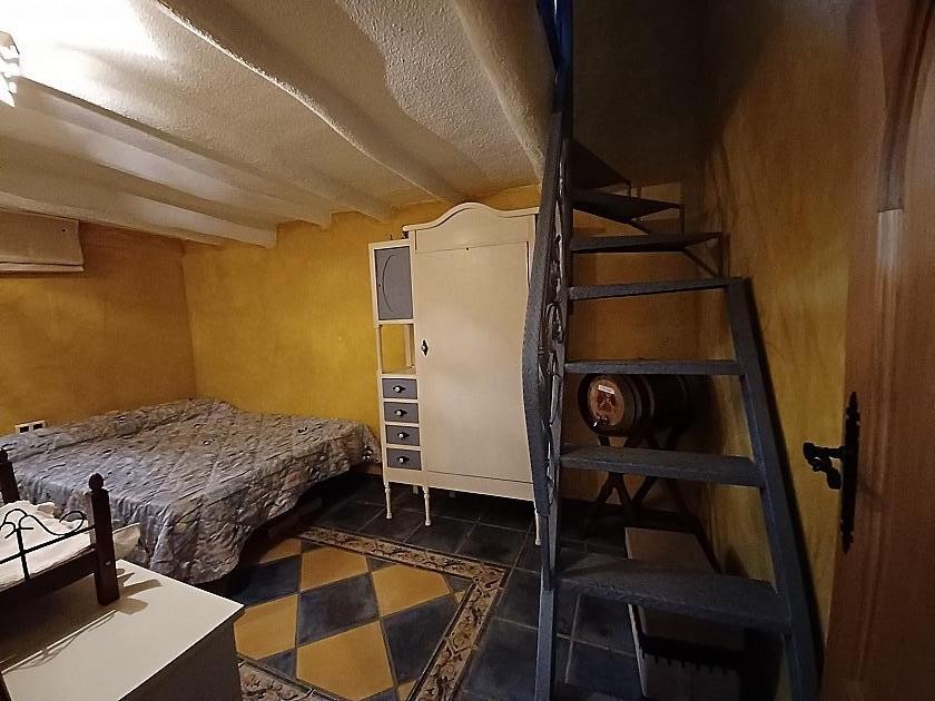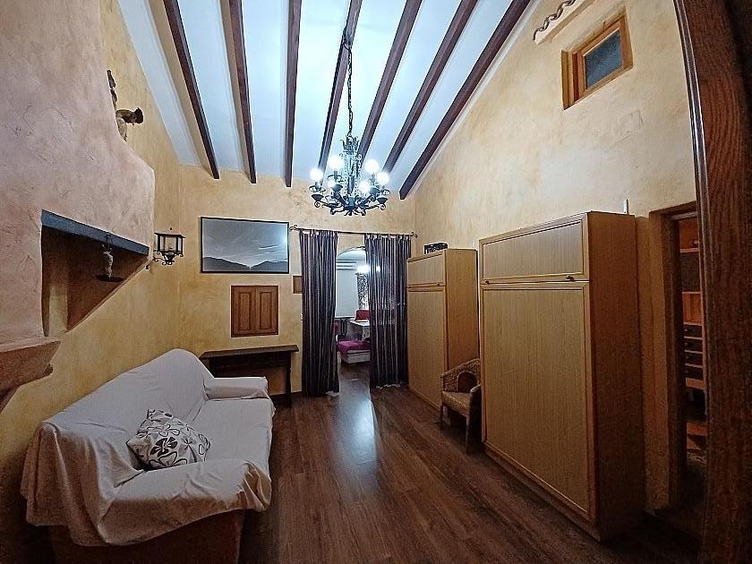 Sie betreten das Grundstück über Doppeltore und gelangen auf die Terrasse vor dem Haus, wo es einen schattigen Bereich zum Sitzen gibt. Wenn man das Wohnzimmer betritt, das über einen Holzofen und eine Klimaanlage (warm und kalt) verfügt, gelangt man über einen Torbogen in ein zweites Wohnzimmer mit einer hohen gewölbten Decke mit Balken sowie einem Brotbackofen und einem in die Wand eingelassenen Lagerraum für Weinflaschen . Von hier aus führt ein Doppelzimmer im Höhlenteil des Hauses, in dem das ganze Jahr über eine konstante Temperatur herrscht. Auf der anderen Seite befindet sich ein zweites Schlafzimmer mit Doppelbett und eine Treppe zum Zwischengeschoss, entweder als Stauraum oder als drittes Schlafzimmer.