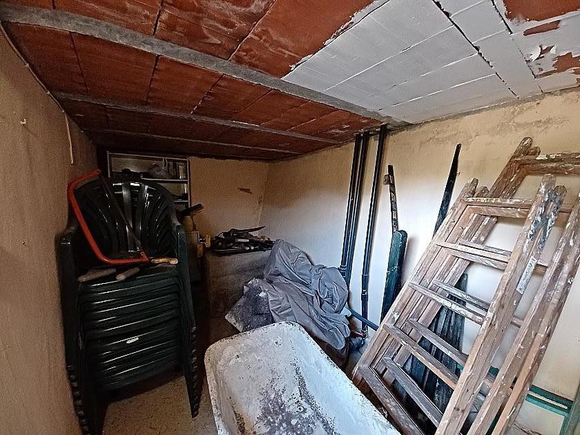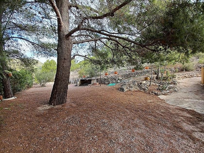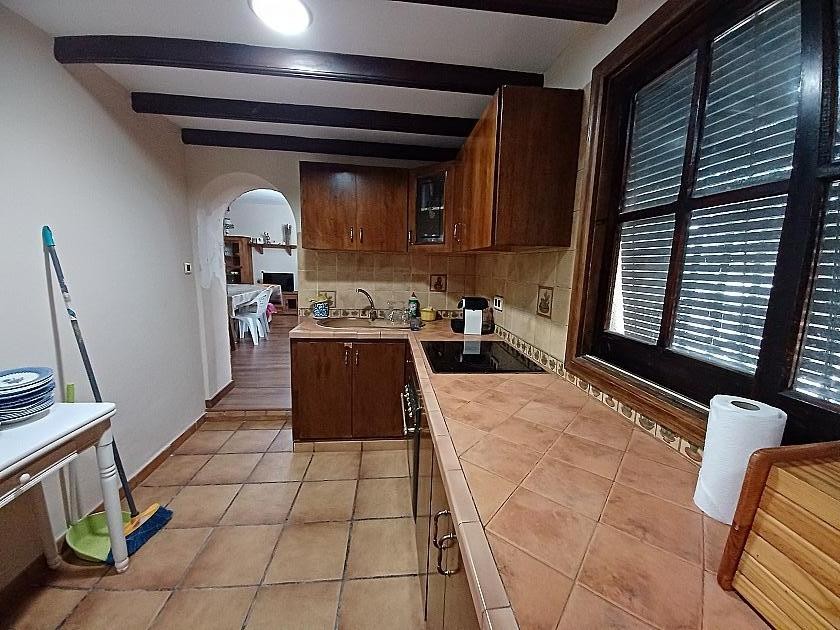 Zurück zum Wohnzimmer, wo wir eingetreten sind, befindet sich die Tür zur Küche, komplett ausgestattet und mit einem riesigen offenen Kamin/Grill für Paella oder BBQ, es gibt eine Speisekammer und eine Tür zur hinteren Terrasse und zum Badezimmer. Neben der Terrasse befindet sich ein zweiter Höhlenraum, der derzeit als Lagerraum genutzt wird.
