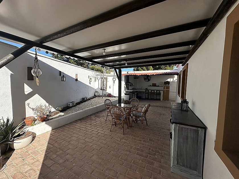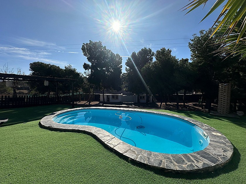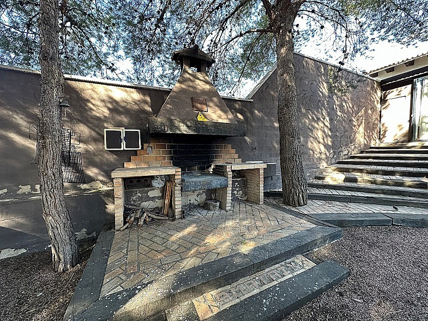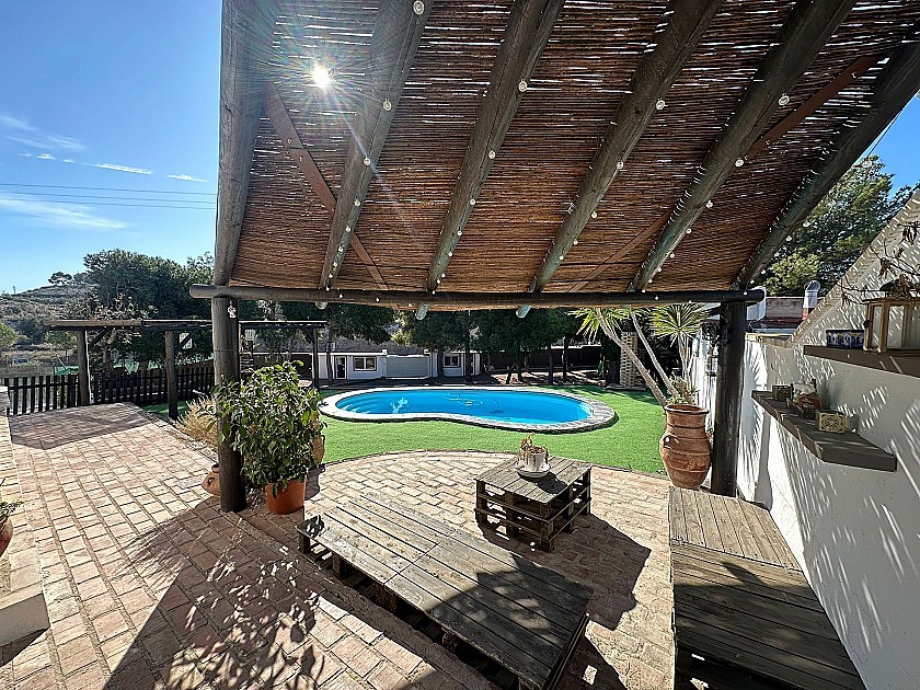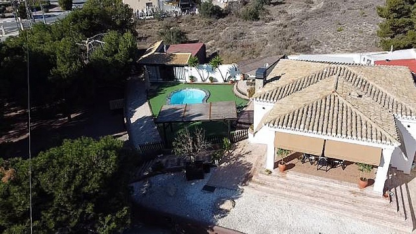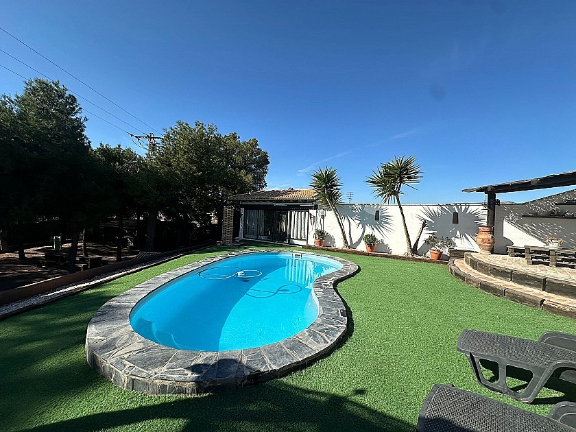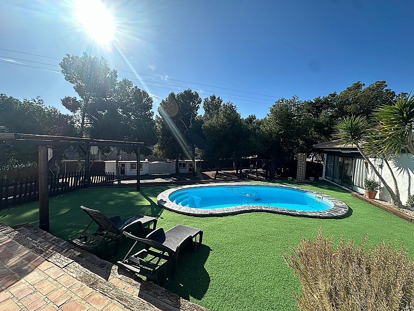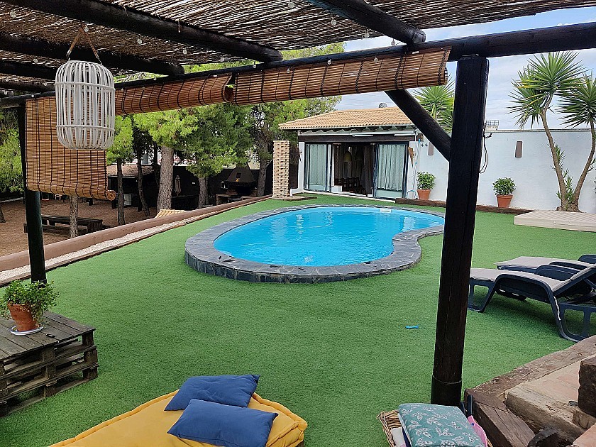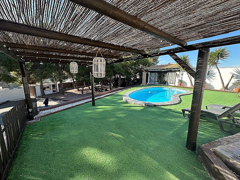 Die Grundstücksgröße beträgt 2000 m² und ist vollständig umzäunt und verfügt über eine automatische Toreinfahrt. Es gibt einen Swimmingpool, eine 45 m² große Sommerküche am Pool mit Bad, einen offenen Grillplatz, zwei Abstellräume, ein Kinderspielzimmer und verschiedene Sitzbereiche. Im Garten gibt es große Pinien, die im Sommer Schatten spenden. Komplett renovierte Villa, bezugsfertig.
