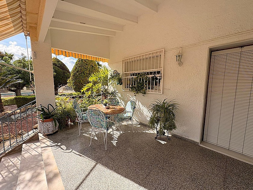 Die Hauptvilla verfügt über 4 geräumige Schlafzimmer und 2 moderne Badezimmer. Das helle Wohnzimmer öffnet sich zu einer großen Terrasse mit Blick auf den 8x4 Meter Pool, umgeben von mediterranen Pflanzen und Sonnenbereichen.