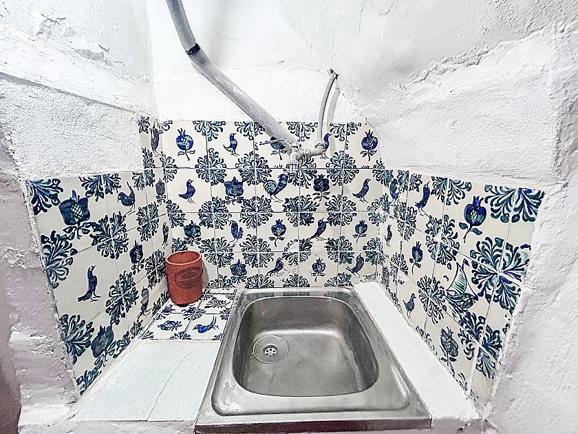 Voll ausgestattete Küche mit traditionellem Kamin und Zugang zu einem kleinen Innenhof.