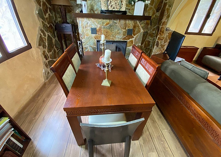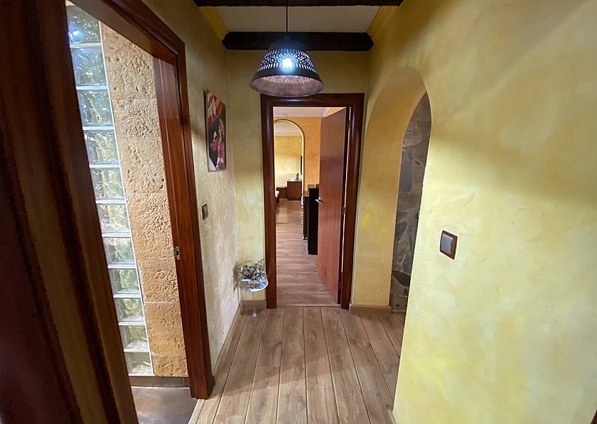 Eine traditionelle, hochwertige Massivholztür öffnet sich zu einem kleinen, aber schönen Flur, von dem aus Sie links oder rechts in zwei Wohnbereiche gelangen. Rechts befindet sich ein Esszimmer mit Zugang über Terrassentüren zum Außenwohn- und Grillbereich.