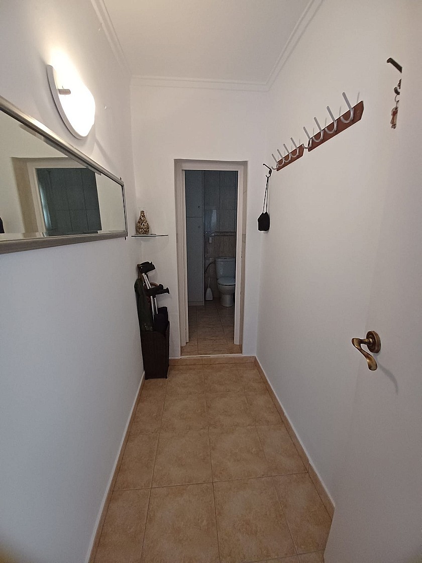 Der Haupteingang des Hauses ist von einer schattigen Terrasse überdacht. Von dort gelangt man in einen Flur. Durch eine Tür gelangt man zur Garderobe und weiter zum großen Badezimmer mit WC, Waschbecken, Badewanne mit Dusche und Elektroheizung. In einem großen Schrank befindet sich außerdem der elektrische Warmwasserspeicher.