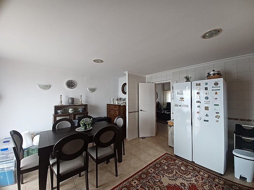 Vom Wohnzimmer aus gelangt man in die große Wohnküche mit voll ausgestatteten Küchenzeilen und viel Platz für einen Esstisch. Alle Geräte sowie ein großer amerikanischer Kühlschrank mit Gefrierfach sind vorhanden. Von der Küche aus führt eine Tür auf die Terrasse und den Poolbereich.