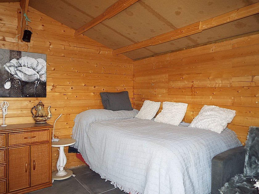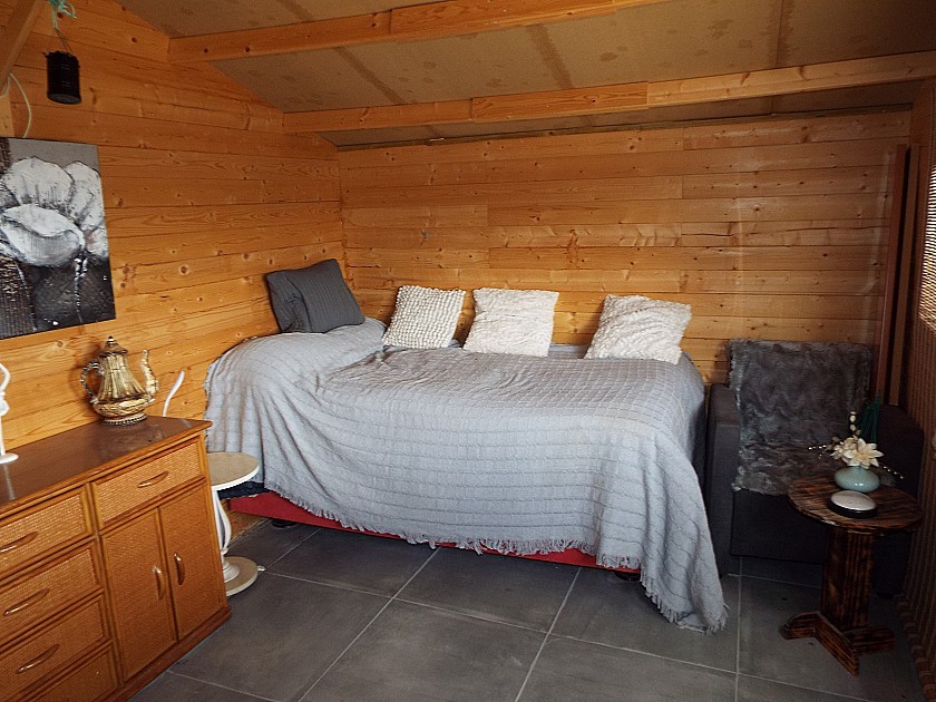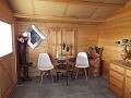 As we come into the plot from the gate, we have a large terraced area with a wooden guest house, away from the main house so providing guests with some privacy, there is a covered area for them to sit and enjoy the spectacular views across the nearby mountain range.
