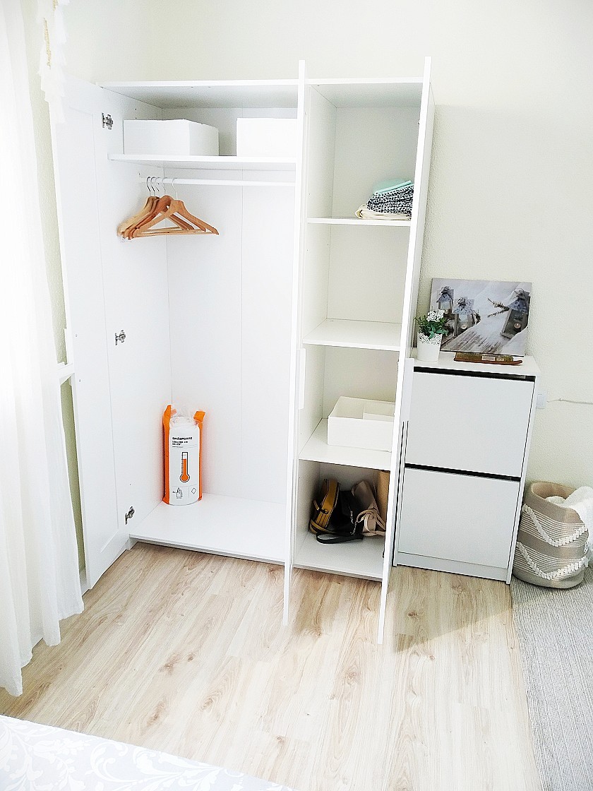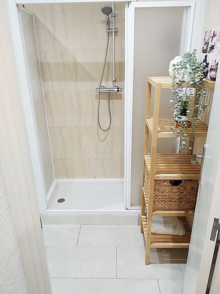 Bathroom: one complete bathroom with walk-in shower and screen, washbasin with vanity unit, auxiliary cabinet, wooden shelving, and bathroom accessories included.