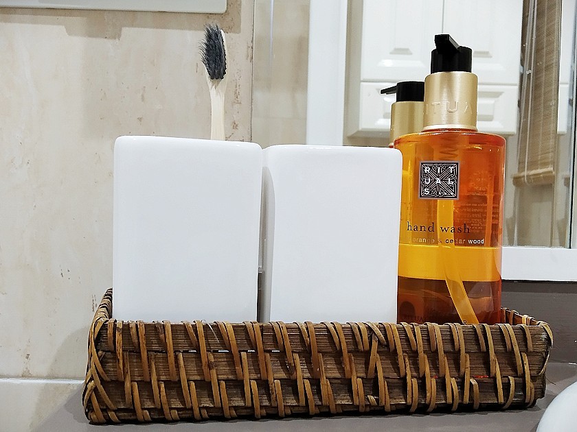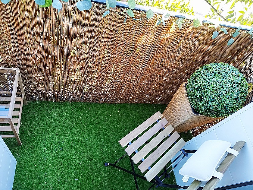 Living-dining room: large 30 m² area, bright and welcoming, with a balcony. Furnished with a dining table and four chairs, a three-seater sofa, a divan, a decorative water fountain, and a bookcase with a small library.