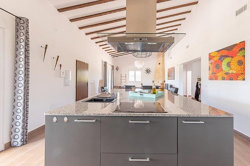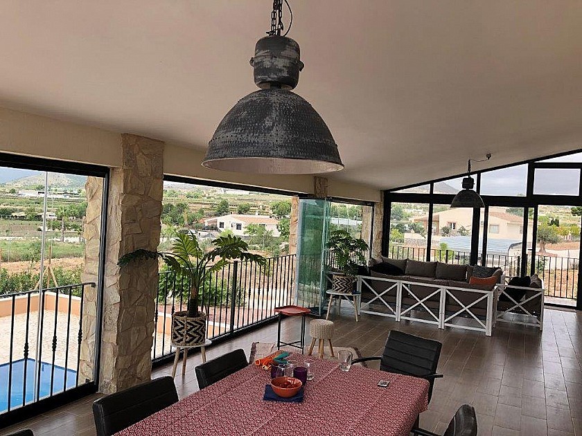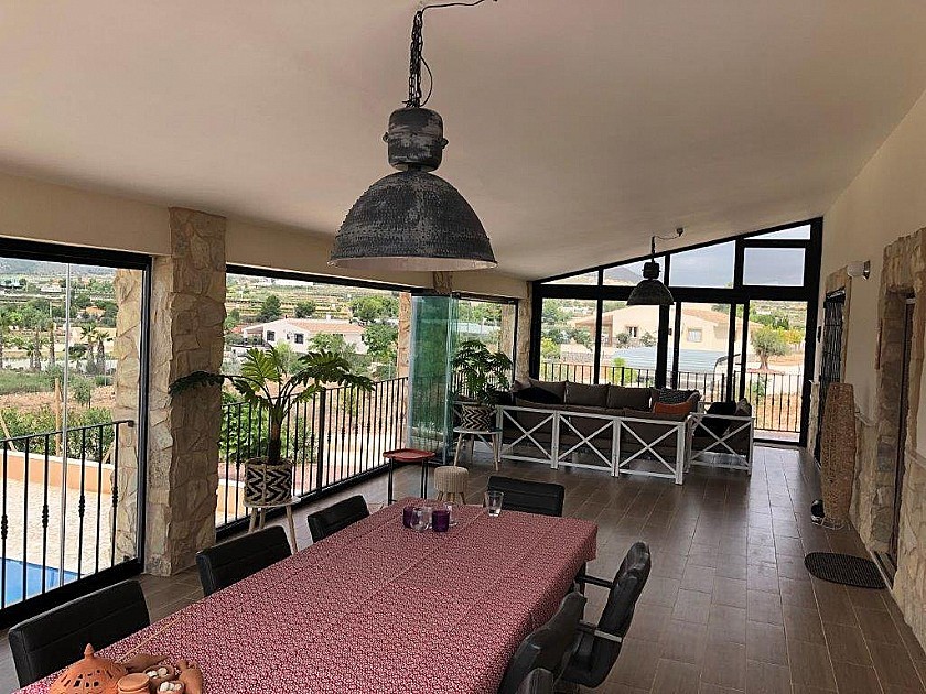 Wow factor villa built 5 years ago but the villa is in brand-new condition, This certainly has the wow factor, the villa is between Aspe and La Romana with amazing views all around, the garden is a gardeners paradise, the main house has a very large terrace partly Glazed with folding glass curtains making it perfect for all year around, inside the house is a large open plan Kitchen with impressive island and living room with fireplace, this leads to 3 double bedrooms a large family bathroom and the master has an ensuite and dressing room, by the pool is the entrance to the guest house which has a large living room with kitchen and 2 bedroom and bathroom, it has a large store at the side, The garden area is zoned with a large carport the house has mains electric and water good internet, electric gates, air-conditioning and heating.