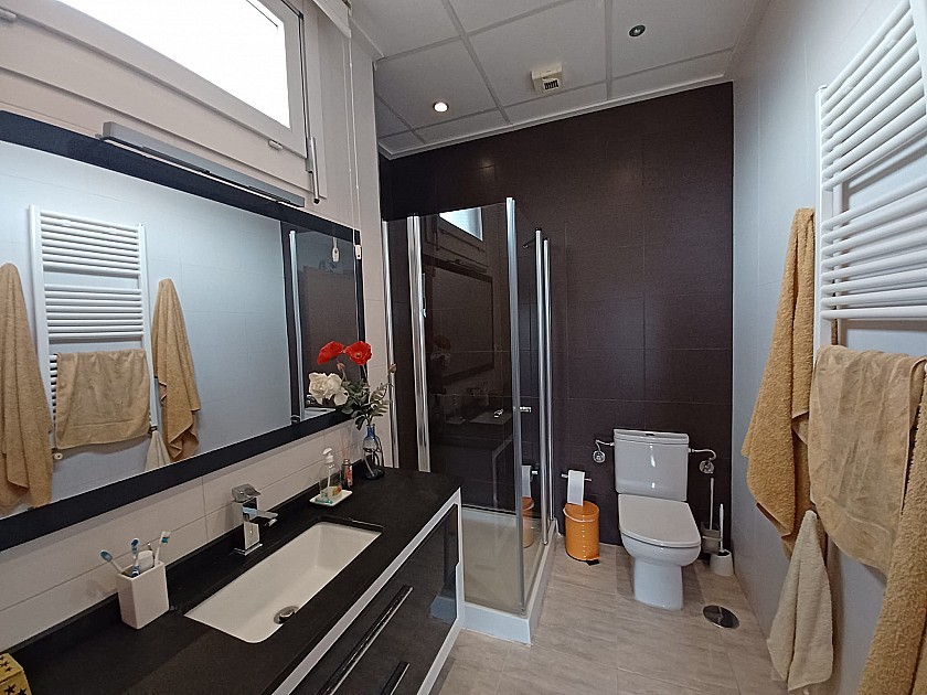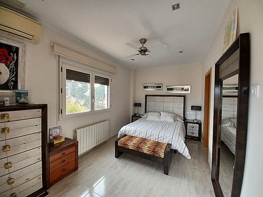 Next bedroom is three, also fitted wardrobes and double doors onto the large terrace. Here is located the access to the solar hot water tank and the air conditioning unit for the ground floor, also connections ready for the first floor unit (all the ducting is pre installed but needs the machine adding). The last door leads into the master suite, here there is a large walk in wardrobe with sliding pocket doors, fully shelved and with LED lighting. From the bedroom there are double doors leading to the terrace facing the front of the house, and also a sliding door to the large ensuite with a big walk in shower, large sink unit and toilet plus a heated towel rail.