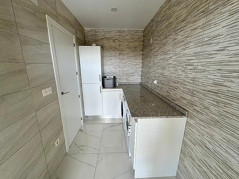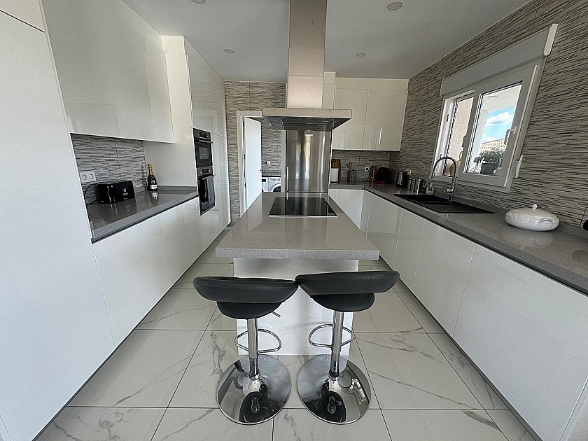 The kitchen is fitted with white high gloss units topped with marble work surfaces, there is also a center island with seating area, all white goods are to be included in the sale. The washing machine is housed in the utility room off the kitchen. There is also on this floor an amazing master suite.