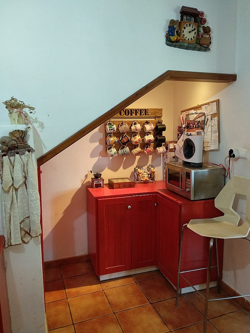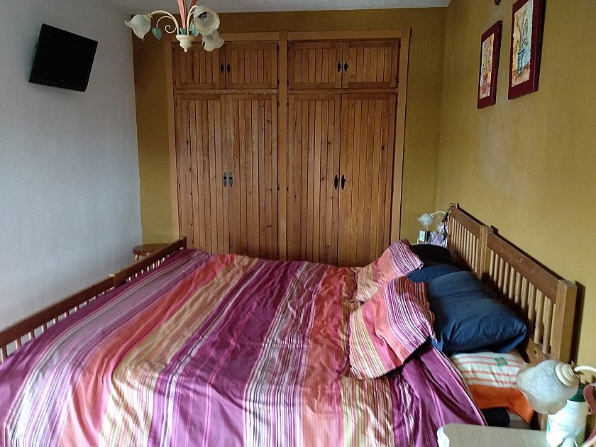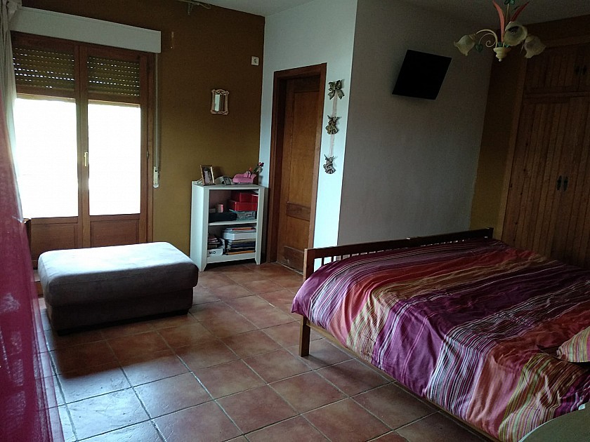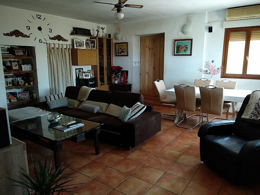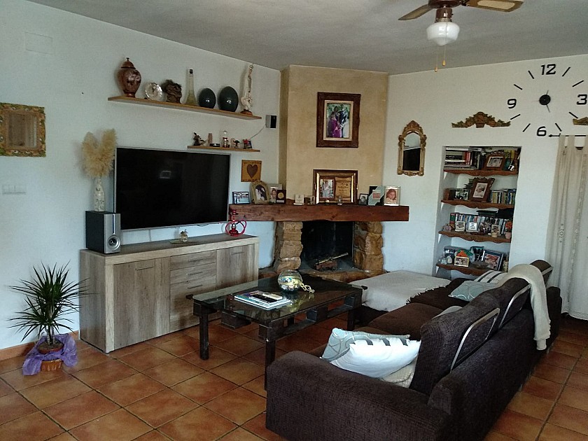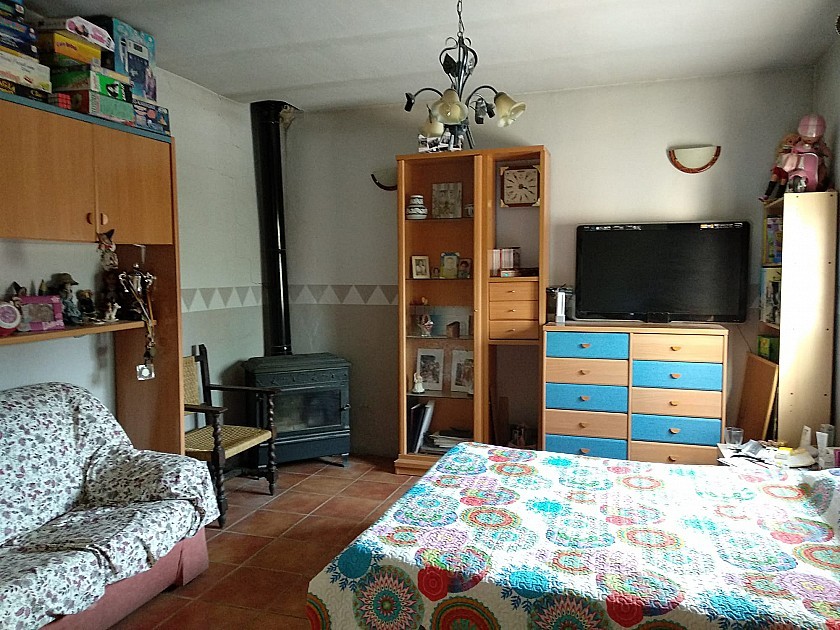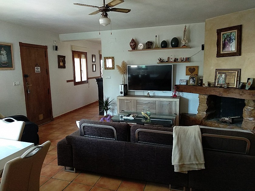 Hallway leading to large lounge with a fireplace + air conditioning, door leading to dining room/ 4th bedroom with estufa, door from lounge to 2 cave rooms,