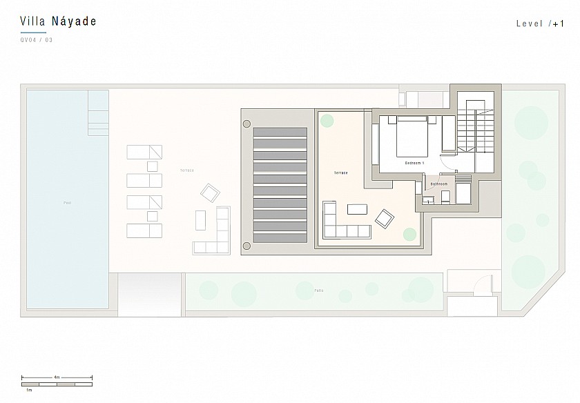 On the first floor, we have the master suite with bathroom, and its own terrace area hat overlooks the gardens and Pool.