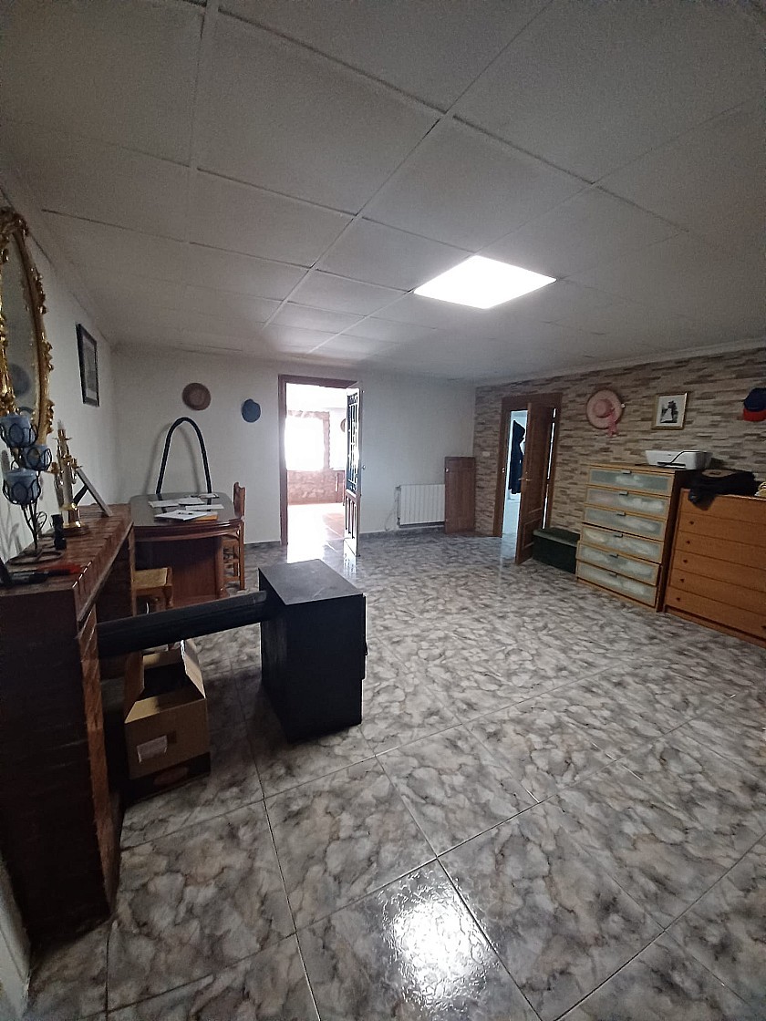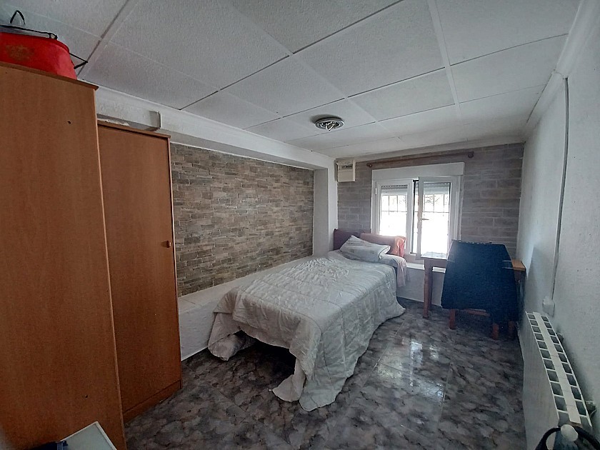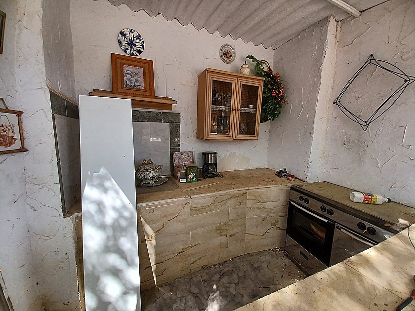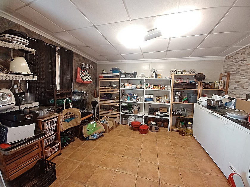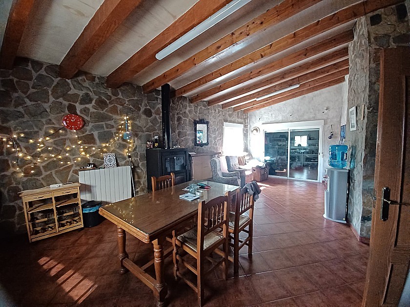 From the living room a door leads to the very big Kitchen / Dining room, with a fully built in rustic style kitchen, air conditioning unit, a huge wood burning stove with oven, and a large glass door leading to a further 4th bedroom or store room ( currently used as a large pantry )