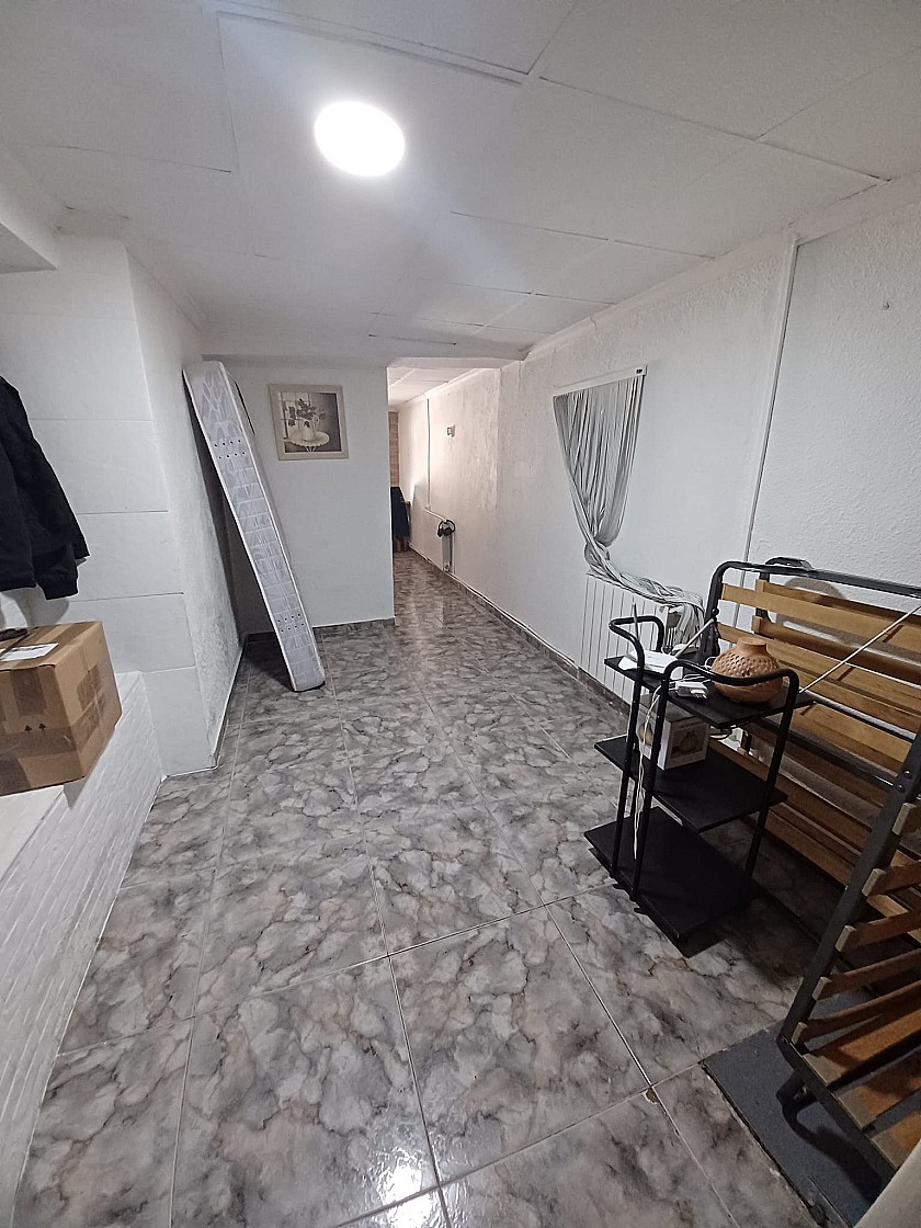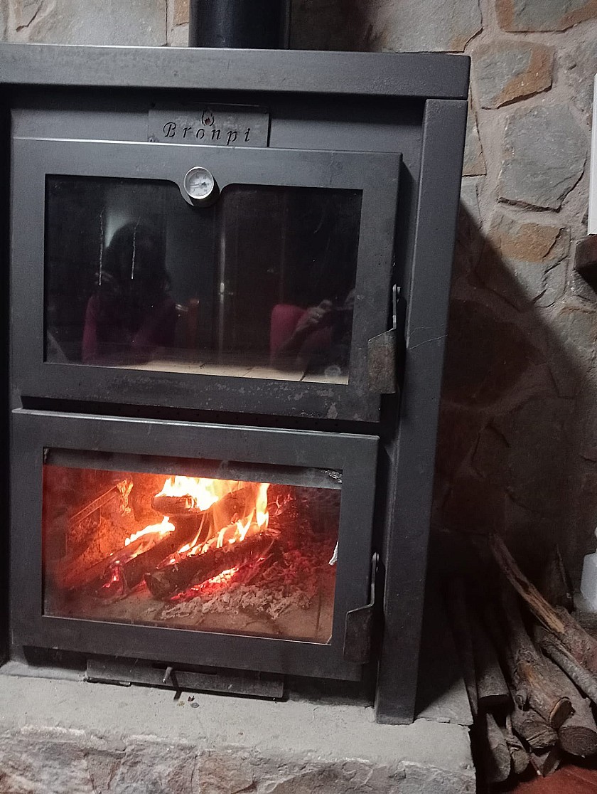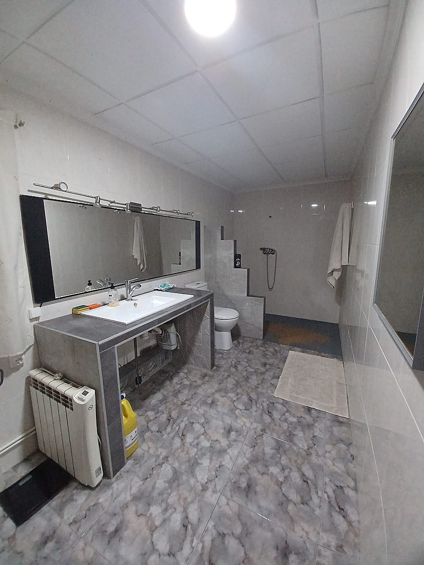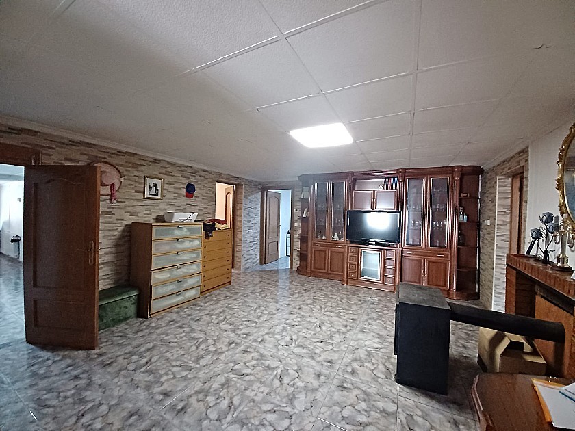 From the living room a door leads to the very big Kitchen / Dining room, with a fully built in rustic style kitchen, air conditioning unit, a huge wood burning stove with oven, and a large glass door leading to a further 4th bedroom or store room ( currently used as a large pantry )