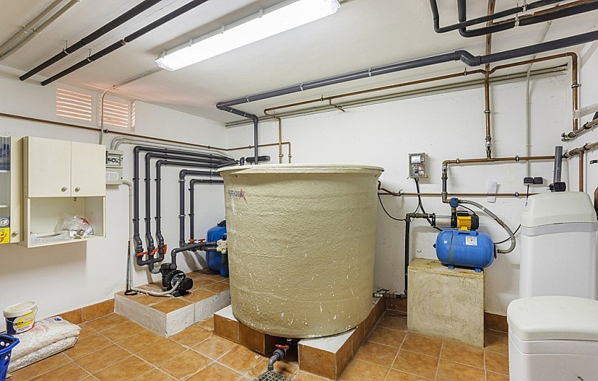 Accessible by car via an electric gate from the public road and via a slight slope you can drive to the basement, which can easily accommodate about 4 to 5 cars. The technical room for the swimming pool and a lockable storage room can also be found here. The elevator and stairwell provide access to the rest of the house.