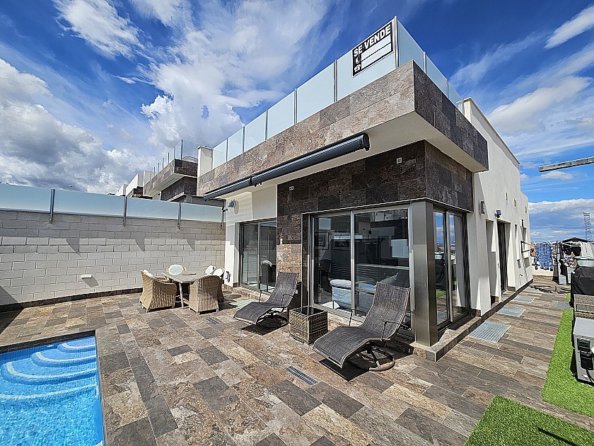 Immaculate South facing detached villa for sale with 4 bedrooms and 3 en-suite bathrooms. This fully equipped property sits on a very sunny plot with a heated swimming pool, easy to maintain tiled terraces and a private solarium with spectacular views towards the pretty pink lakes and pine forest.