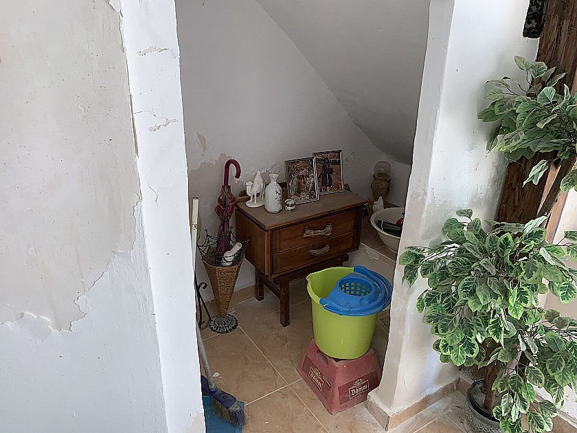 The front door of the property is the first highlight, a huge thick wooden door with large black rivets, and Church style key set the tone for this authentic Spanish property. The entrance hall has the stairs to the first floor, and a small storage cupboard underneath. The stairs have a nice wooden railing up to the next floor. From here we have the bathroom, nicely tiled and with a walk in shower.