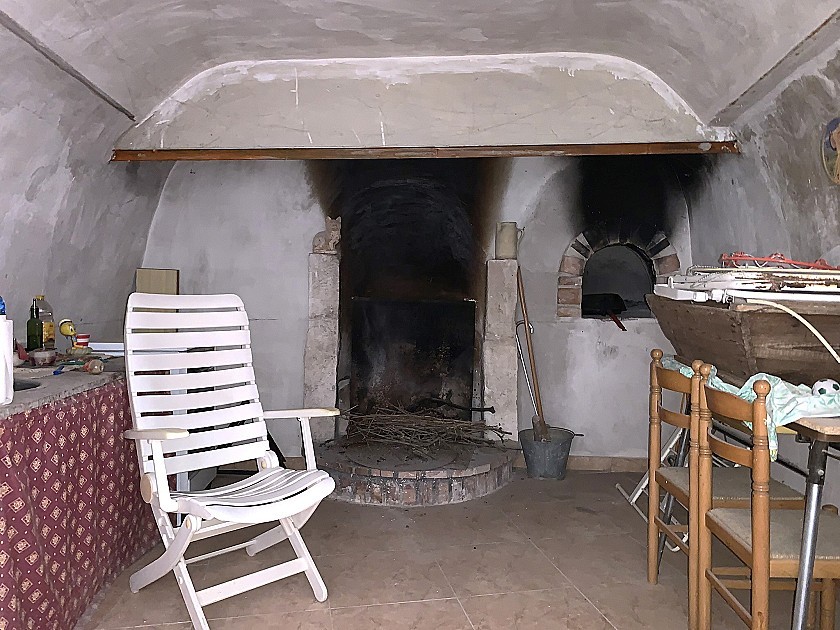 Underneath the wooden beam we move into the living area, and we have a small bedroom at the rear end of the house, and to the left we have the kitchen area. This has a sink on the left side, and large barbecue style cooking area, and a separate bread & pizza oven. There is also a storage room off the kitchen.