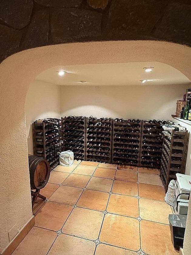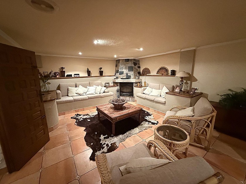 El sótano ofrece un amplio espacio con garaje, un amplio salón-comedor diáfano con chimenea, una cocina abierta adicional con despensa, dos dormitorios y un baño, ideal para invitados, una suite de invitados o un rincón privado.