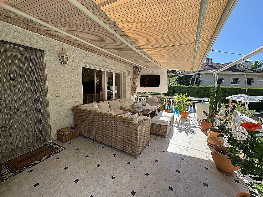 Esta villa de 319 m², situada en la exclusiva comunidad cerrada de Loma Bada en Petrer-Elda, ofrece un estilo de vida lujoso y sereno a solo 20-25 minutos de las impresionantes playas de la ciudad y el aeropuerto de Alicante. La propiedad cuenta con cuatro espaciosas habitaciones y tres baños modernos, perfectos para familias o para recibir invitados. Las principales áreas de estar de la villa son luminosas y abiertas, con grandes ventanales que permiten que la luz natural fluya por todas partes. El propietario actual ha modernizado la villa con una nueva e impresionante cocina equipada. En el piso principal tiene 3 habitaciones dobles, una principal con baño privado y un baño familiar, las escaleras conducen a una segunda sala de estar con cocina nueva, dormitorio doble y baño con acceso directo al exterior, lo que hace que esta casa sea perfecta para una familia extensa o perfecta para invitados.