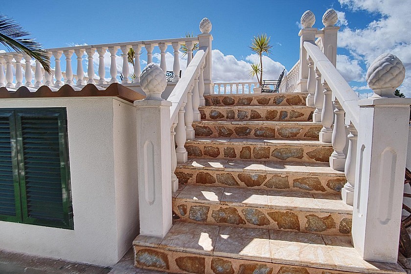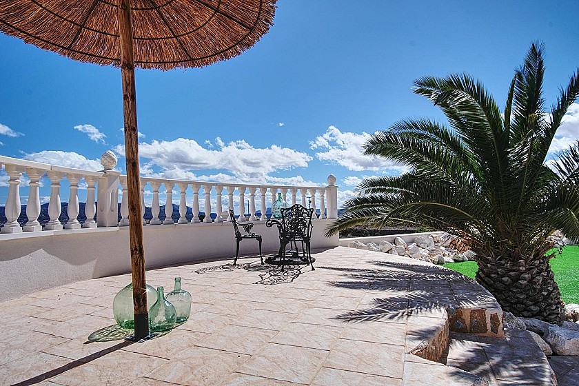 Al entrar al exterior, encontrará una hermosa terraza, una de las muchas que ofrece esta casa, que le ofrece sol durante todo el día para relajarse mientras contempla las impresionantes vistas a la montaña.