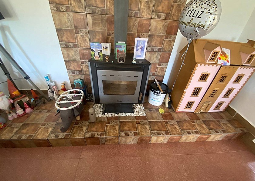 Al abrir la puerta de la casa se accede a una enorme terraza cubierta con muchas ventanas que se abren con el buen tiempo para dejar entrar la brisa de la montaña. En los dos o tres meses más fríos hay una chimenea de pellets, y me imagino que este es el espacio que más se aprovecha, ya que es realmente increíble. Los dos dormitorios también tienen ventanas que dan a la terraza cubierta.