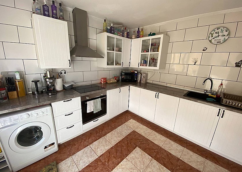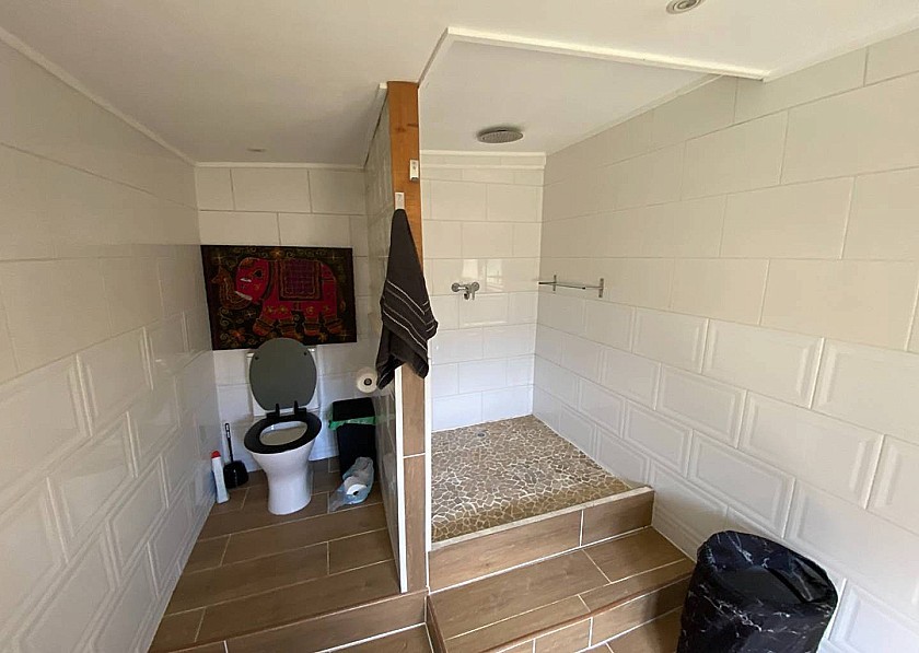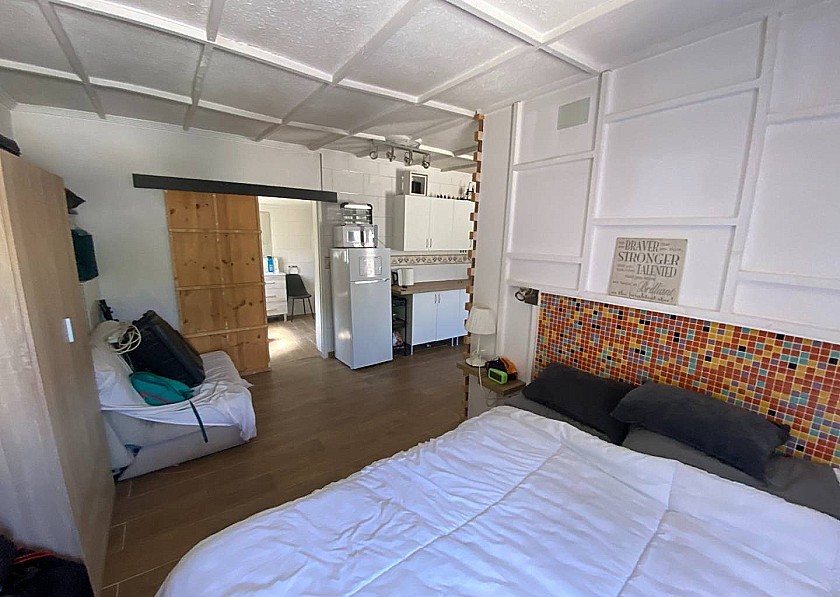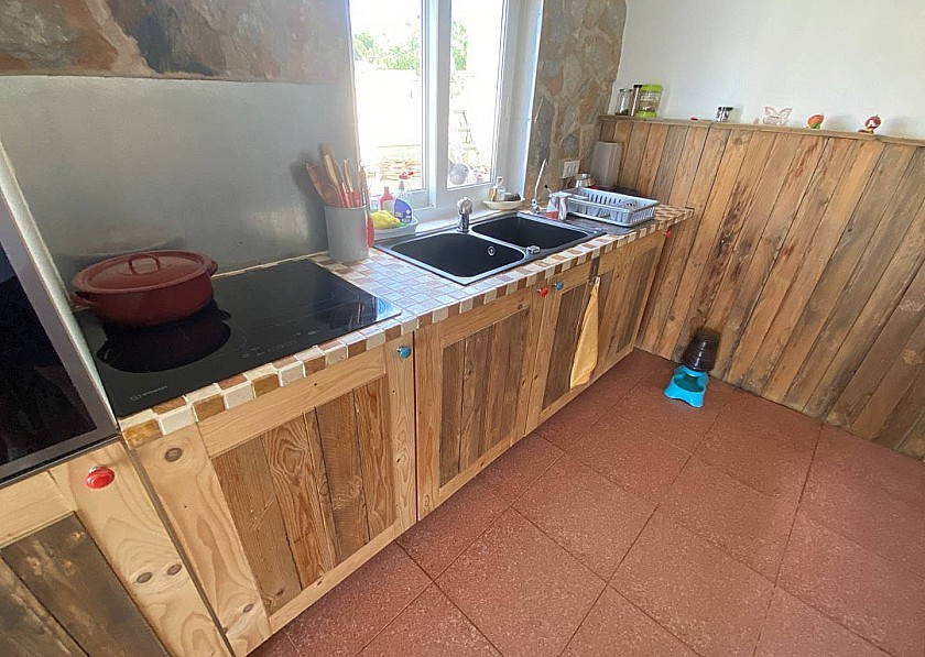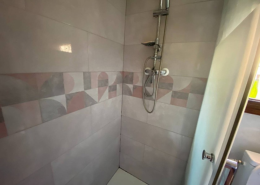 Volvamos a la terraza cubierta, más pequeña, y entremos en el apartamento de 2 dormitorios. Una vez más, este ha sido cuidadosamente diseñado y resulta inmediatamente cómodo y acogedor. Hay dos dormitorios amplios y una cocina espaciosa, magníficamente equipada. El baño es nuevo, por supuesto, y cuenta con grifería de alta calidad. Si yo fuera un huésped y me dieran este apartamento, no querría irme, la verdad. Se trata de una propiedad increíblemente sólida con paredes gruesas, lo que significa que hay muy poca o ninguna posibilidad de que la casa y el apartamento molesten.