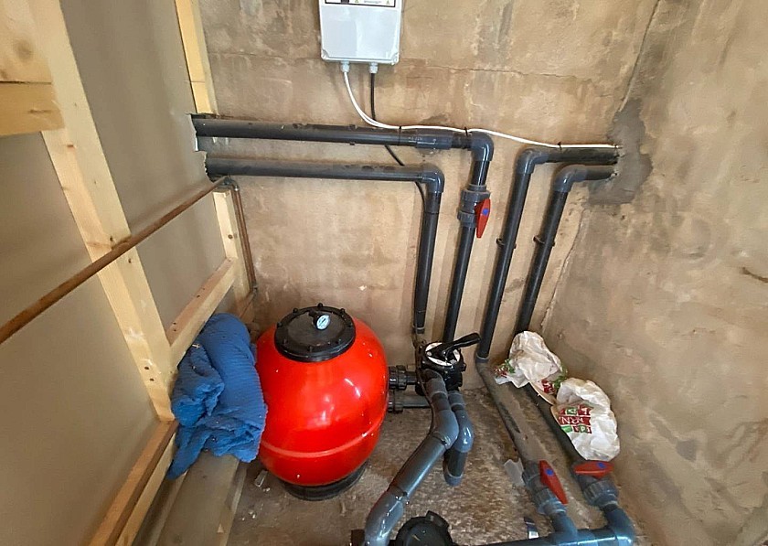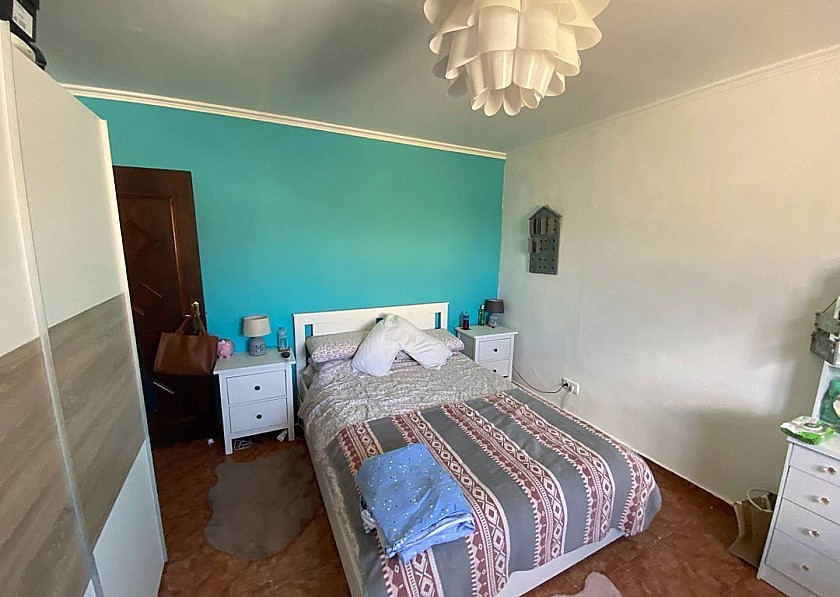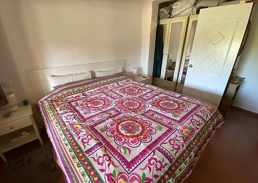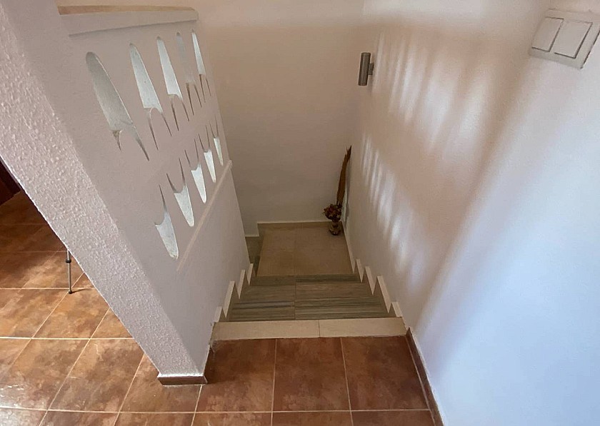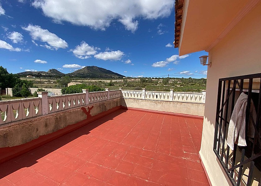Subiendo las escaleras a la planta superior, se llega a un pequeño rellano con una puerta que da acceso al tercer dormitorio, muy privado, y otra que da acceso a la increíble terraza que rodea dos tercios de la propiedad. Es impresionante, al igual que las vistas desde aquí, desde el terreno hasta las montañas, y se puede contemplar la piscina recién embaldosada, de aproximadamente 2,4 x 1,2 m, con bomba y filtro nuevos ocultos en el cuarto de la piscina.