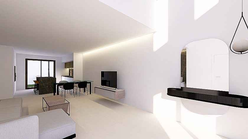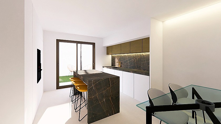 Pavimentos: En el interior, toda la vivienda está revestida con pavimentos de gres porcelánico de primera calidad, ofreciendo durabilidad y una estética elegante. Los rodapiés de gres porcelánico blanco combinan armoniosamente con la carpintería interior.