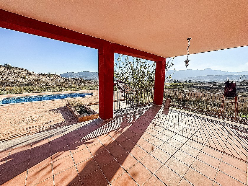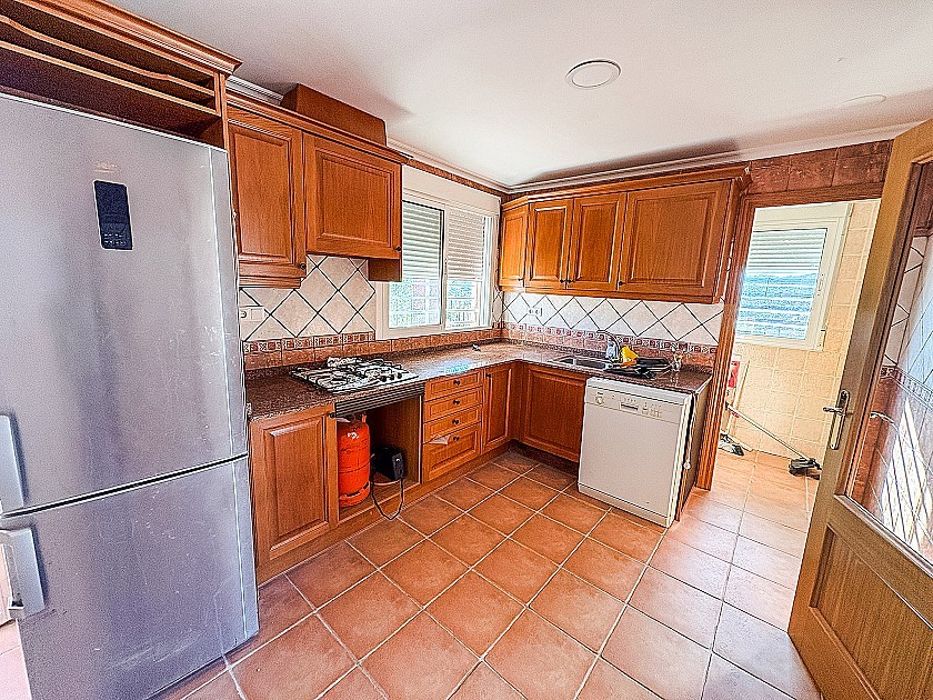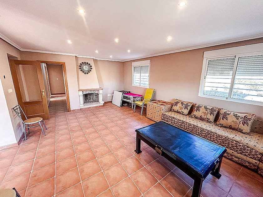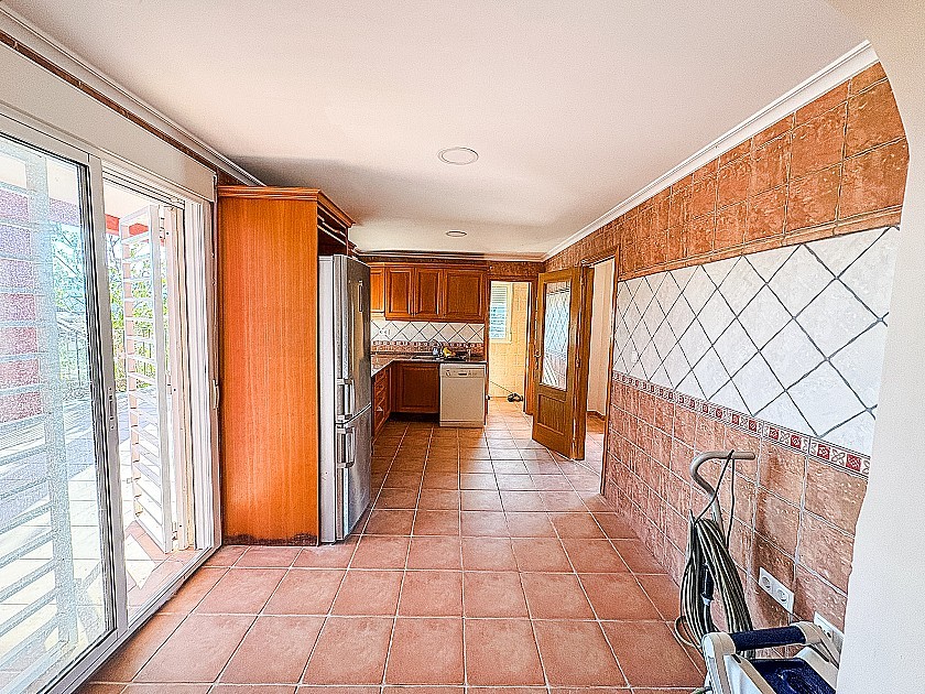 L’entrée principale donne sur une véranda accueillante, qui mène à un salon-salle à manger spacieux et lumineux, équipé d’une cheminée à bois. Depuis cette pièce, on accède à une cuisine ouverte entièrement équipée, avec une buanderie pratique et un accès direct à la véranda avec vue sur la piscine.