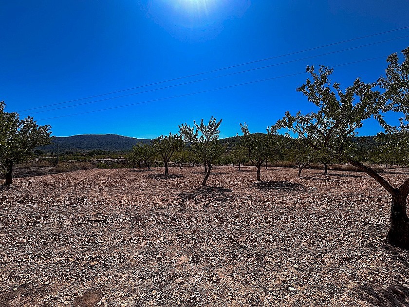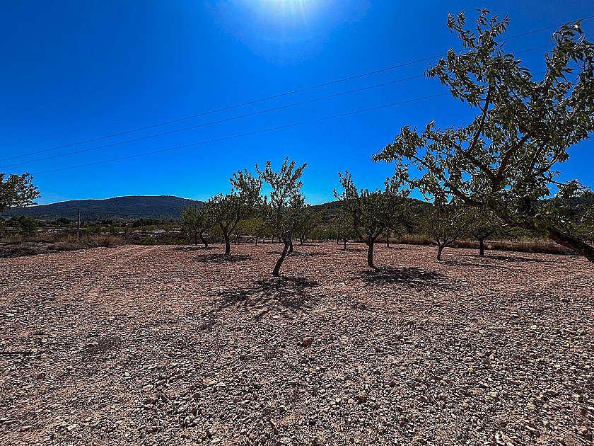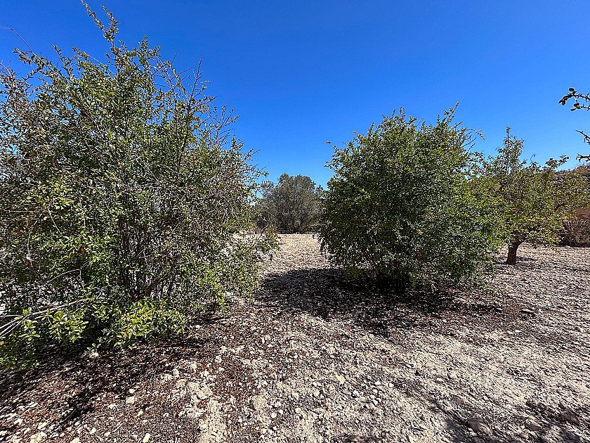 Le terrain mesure environ 5.000 m², non clôturé, et est réparti sur trois niveaux différents. Il abrite environ 100 amandiers et plusieurs oliviers, idéal pour les amateurs de nature ou pour développer un petit projet agricole. Une terrasse se trouve à côté de la maison, les deux autres étant situées plus loin.