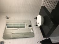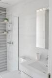 Les salles de bains comprennent une colonne de douche, un receveur de douche ou une baignoire, des meubles vasques (différents coloris au choix) avec lavabos, robinetterie et miroirs, ainsi qu'un large choix de carrelage mural et de carrelage au sol en céramique (différents coloris, imitation bois, etc.).