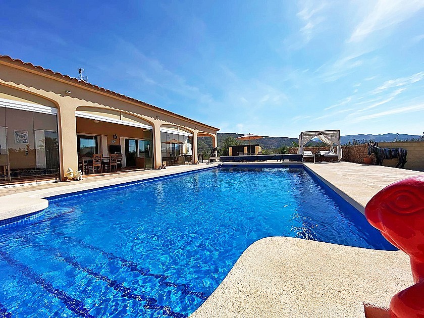 Cette belle villa dispose de trois chambres et de deux salles de bains, elle se trouve sur un grand terrain de 12000m2, 4000m2 étant clôturé, le reste du terrain est planté d'oliviers.
