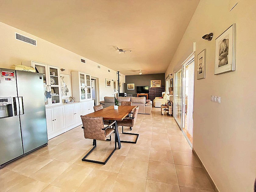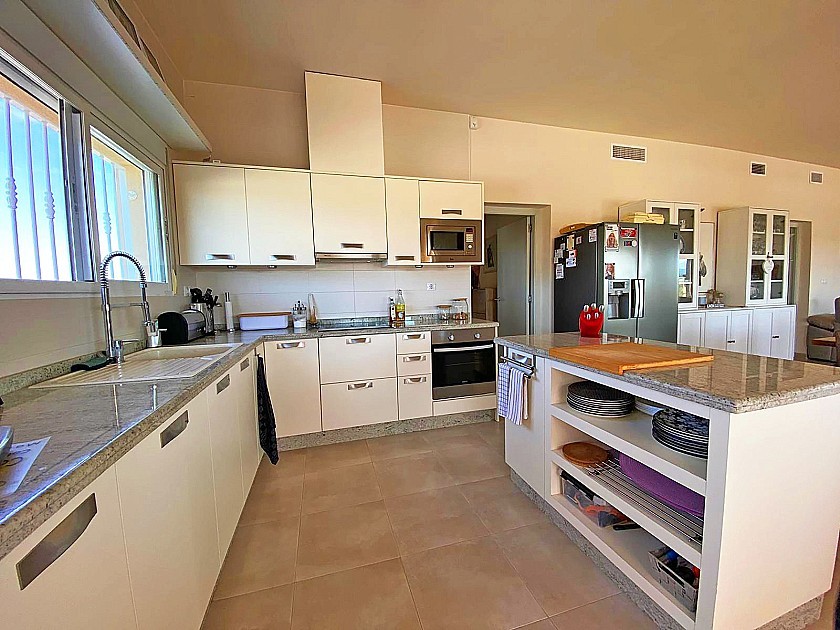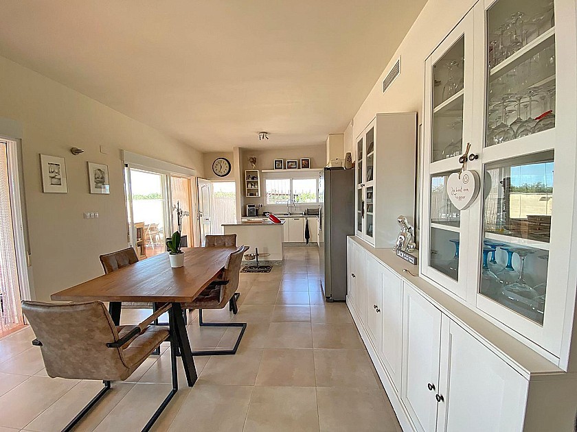 En entrant dans la villa, vous verrez sa belle grande terrasse dont la majorité est vitrée, parfaite pour une utilisation toute l'année. Le salon, la salle à manger et la cuisine sont aménagés en plan ouvert, ce qui fait de cette villa un espace très convivial. Le salon dispose d'un poêle à granulés parfait pour évacuer le froid pendant les mois d'hiver les plus frais. La cuisine est dotée d'éléments élégants de couleur crème et intègre un îlot central, les services de cuisine étant en granit. La villa dispose d'une installation pour la climatisation qui nécessite actuellement les unités.