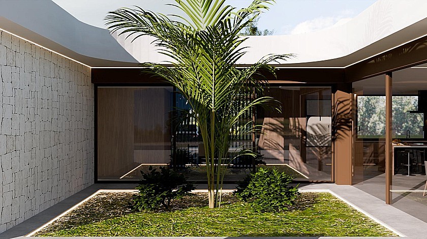 Opmerking: In het getoonde model zijn het gastenverblijf, de zomerkeuken en het extra betonnen terras optioneel en niet inbegrepen in de basisprijs.