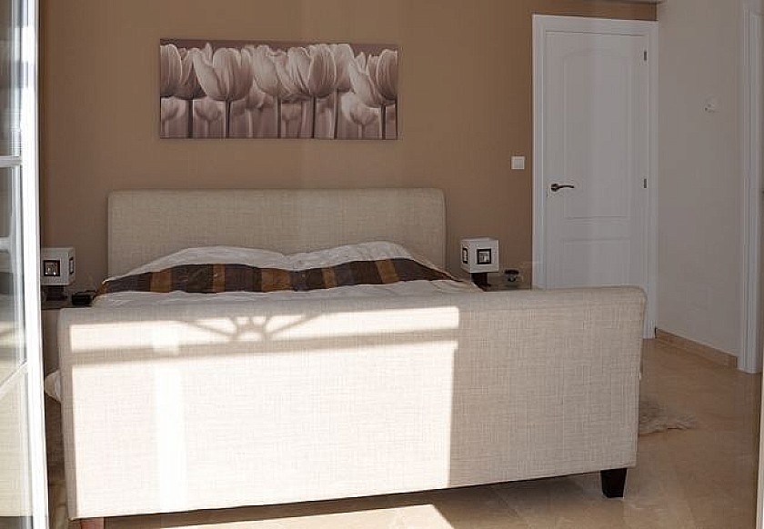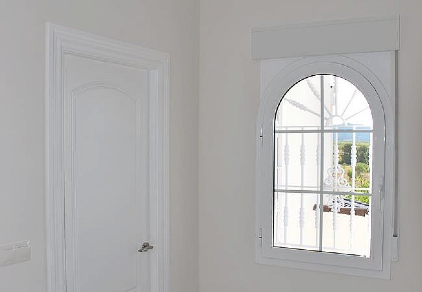5.- TIMMERWERK. 5.1.- Buitenschrijnwerk. Gelakt aluminium timmerwerk met koudebrugonderbreking. Alle ramen zijn dubbel glas voor een betere thermische en akoestische isolatie, type Climalit of vergelijkbaar. Er wordt een compacte rolluikkast geïnstalleerd in een kleur die past bij het timmerwerk, met thermische aluminium rolgordijnen en de terrasdeuren zijn gemotoriseerd. 5.2-Binnendeuren. De toegangsdeur tot het huis wordt versterkt met twee stalen platen en een veiligheidsslot. Binnendeuren van DMF, met een effen, wit gelakt blindpaneel, verchroomd beslag en stalen handgrepen.