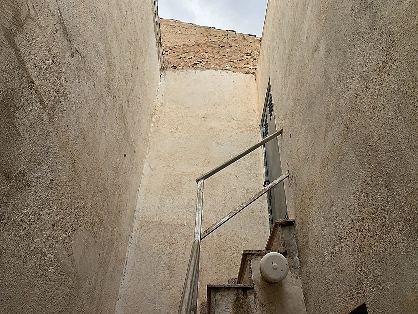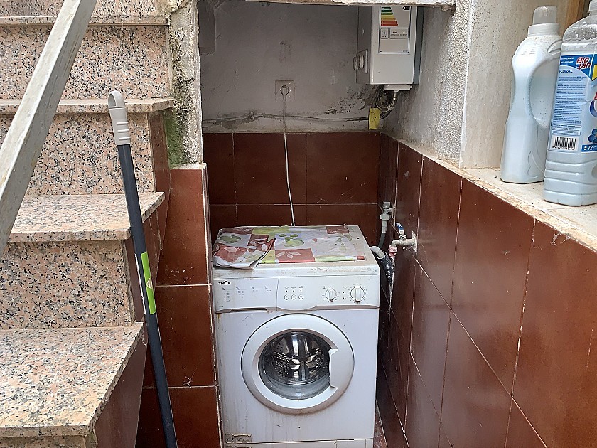 Verderop vinden we de familiebadkamer met douche en vervolgens de achterdeur die leidt naar een klein terras met bijkeuken onder de trap naar de eerste verdieping, met de gasboiler voor warm water en de wasmachine. Boven is de ingang naar de eerste verdieping, een onbebouwde ruimte van 49 m² die gebruikt kan worden als extra opslagruimte, een tweede woonkamer, een klein appartement of een grote extra slaapkamer.