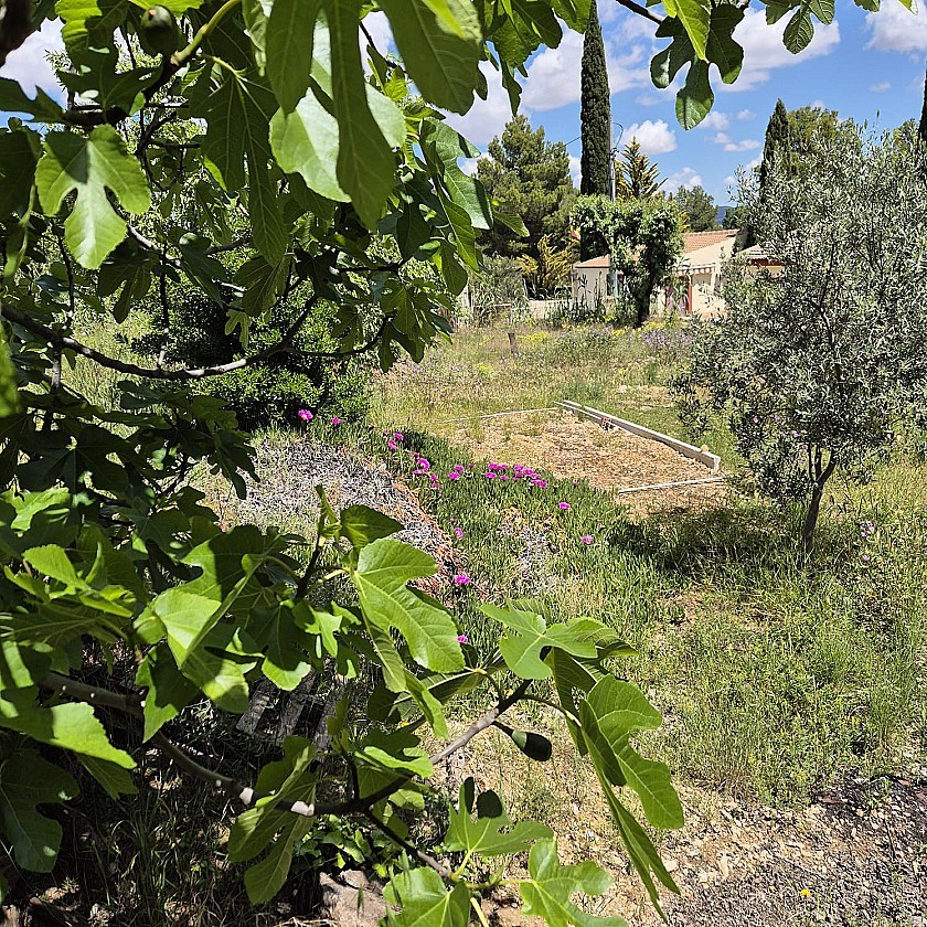 Er is een zomerkeuken met een barbecue en een paar treden naar beneden naar de lager gelegen tuin, waar zich een tweede zit- of speelplek voor kinderen bevindt en die eveneens met bomen is beplant. Er is ook een achteringang naar dit deel van de tuin.